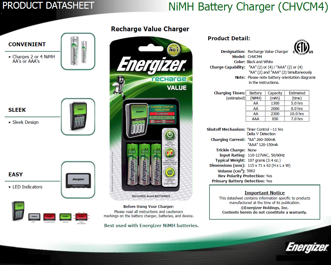 • Charges 2 Or 4 AA or AAA Nimh batteries